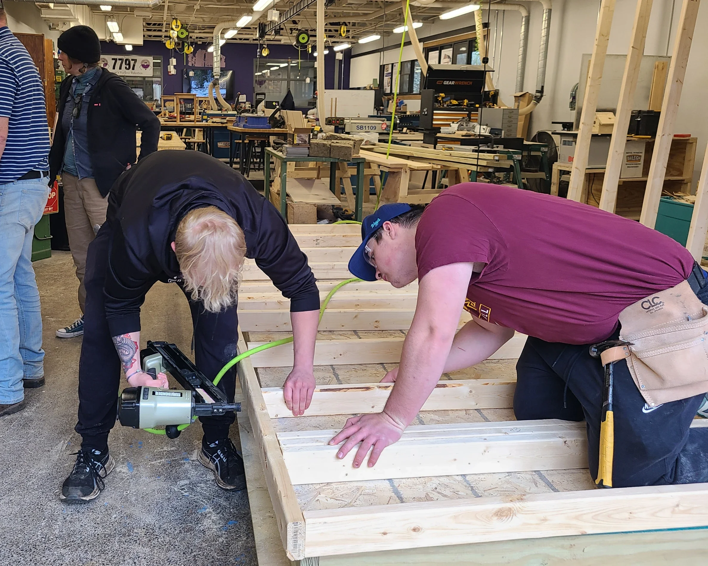 Wrenshall and Cloquet high school carpentry students are mid-build on their solar-powered, high performance “studio sheds”! Last week, Just Housing was delighted to visit each school and see the progress both classes are making. Cloquet students are framing the walls; Wrenshall students have walls and roof framed and are sheathing the structure, sealing the sheathing as the air barrier.